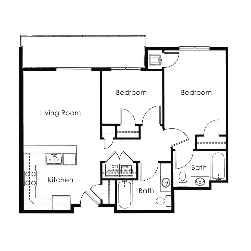 Apartment Model: 2 Bed 2 Bath | 833 sqft2 Bedroom, 2 Bath, 833 sq ftUnavailable2 Bed 2 Bath | 833 sqft - Floorplan 1