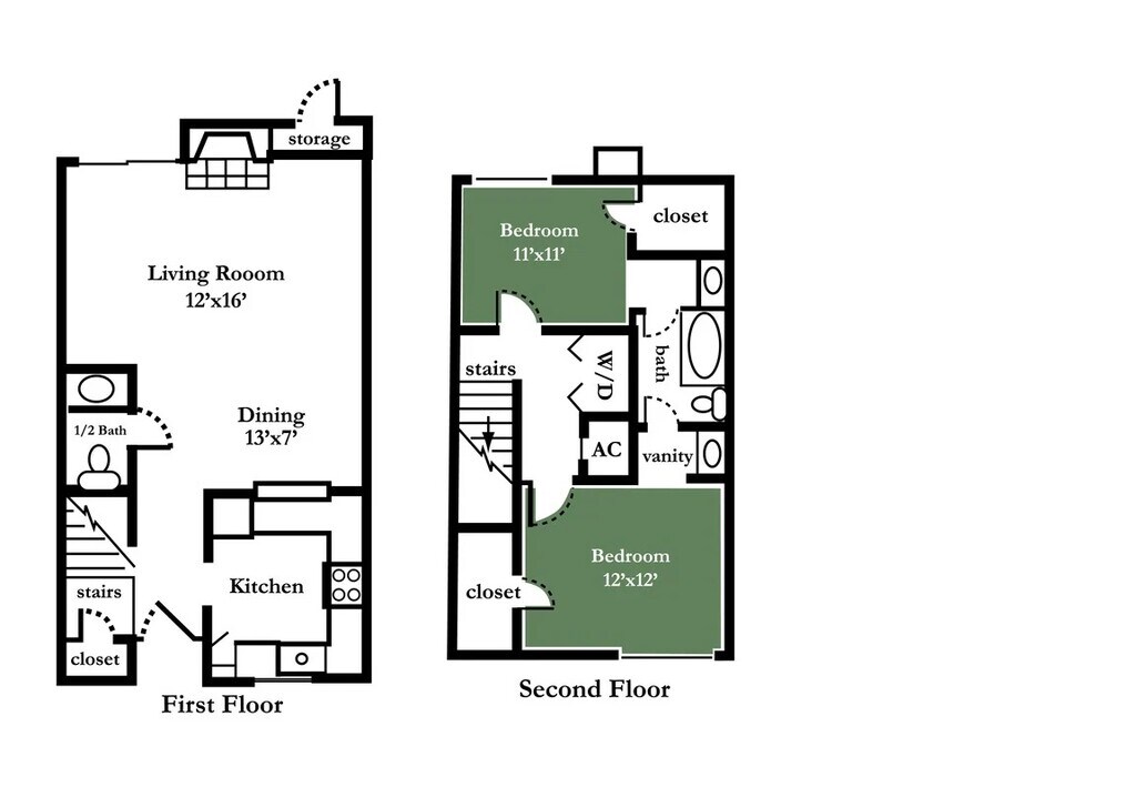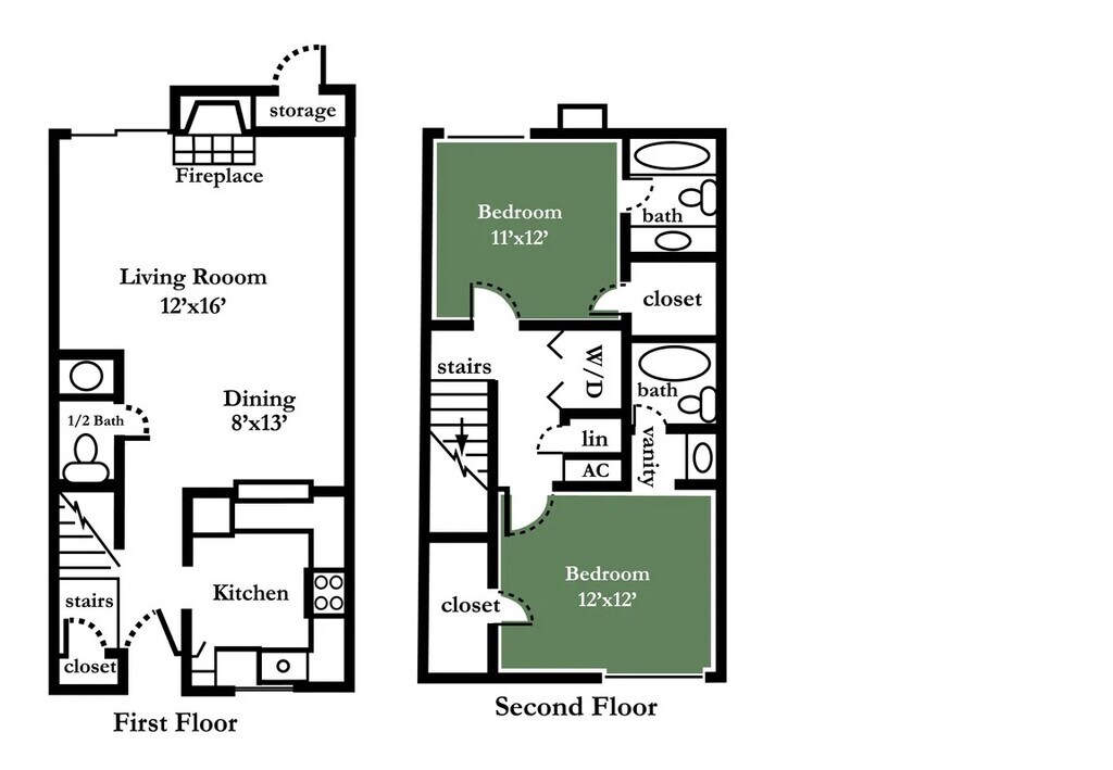 1 Bed, 1.5 baths - Floorplan 1 2 Bedrooms