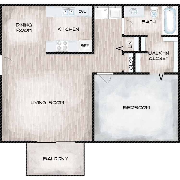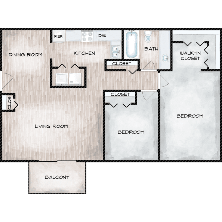 Apartment Model: 1 Bed 1 Bath$9851 Bedroom, 1 Bath, 652 sq ftUnavailable1 Bed 1 Bath - Floorplan 1 2 Bedrooms