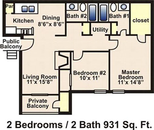 Apartment Model: 2x2From $1,1902 Bedroom, 2 Bath, 931 sq ftAvailable Now![]() - 2x2 - Floorplan 1