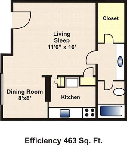 Apartment Model: Efficiency$790Studio, 1 Bath, 463 sq ftAvailable Now![]() - Efficiency - Floorplan 1