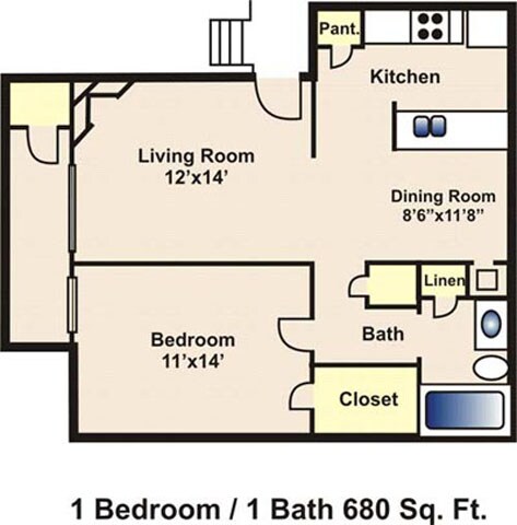 - 1 Bedroom- Floorplan 1x11 Bed, 1 Bath, 680 sq ft- Model Gallery- Floorplans- Photos- Availability Details- Price - Availability Date - Unit - Sq Ft - $890 - Call for Availability - 1x1 - 680 sq ft - Model Amenities and Features- Features- Air Conditioning