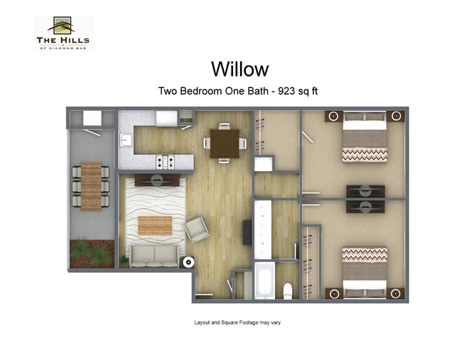 - 2 Bedrooms- Willow- From $2,5952 Beds, 1 Bath, 923 sq ftAvailable Now- Model Gallery- Floorplans- Availability Details- Price - Availability Date - Unit - Sq Ft - Deposit - From $2,595 - Available Now - Willow - 923 sq ft - $500 - Model Amenities and Features- Features- Air Conditioning