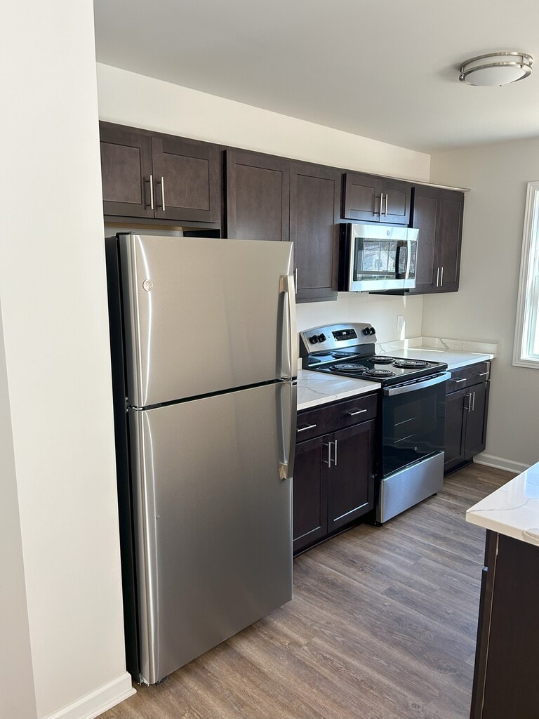 If you’ve been searching for rural living that offers a neighborhood feel with the convenience of local shopping, look no further. Hillside Place in Springville, NY is the perfect place to call home. Local shopping establishments, doctors’ offices (including an urgent care and hospital), pharmacies, breweries, and restaurants are just minutes away. Hop on Route 219 for a trip up to Buffalo and beyond. Within a short drive, you have access to year-round outdoor adventures in Ellicottville, hiking through Zoar Valley, and the scenic hills of Allegany State Park (a must see in the Fall season). Named after the topography of the property, Hillside Place presents a modern farmhouse style exterior including a partial stone front, private individual entrances, patio, and attached garages. The community is comprised of 12 buildings, with two to six homes in each building depending on the design. Our residences are 1140 square feet designed with various lifestyles in mind. Each 2-bedroom, 1.5-bathroom townhome is furnished with beautiful, easy to maintain LVT flooring throughout. Hard surface countertops, stainless steel appliances, an in-unit washer/dryer, and central air are design amenities that are sure to make you feel comfortable and content. We understand pets are family, which is why our townhomes are pet friendly (with restrictions). Water and trash removal is included.