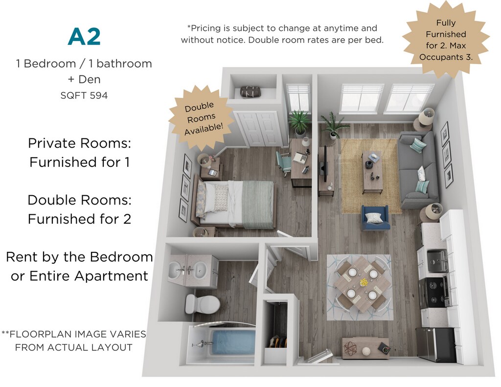 A2 - Floorplan 2 Apartment Unit: Entire UnitApartment Model: A2$3,7501 Bedroom, 1 Bath, 582 sq ftAvailable August 17, 20262 Bedrooms