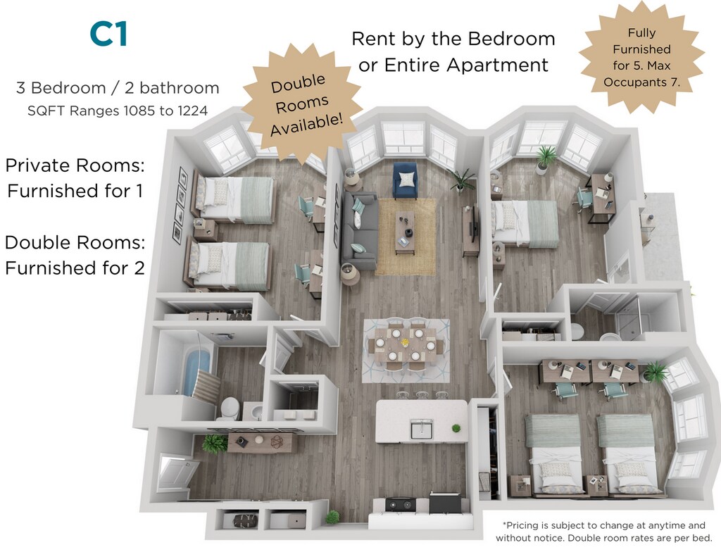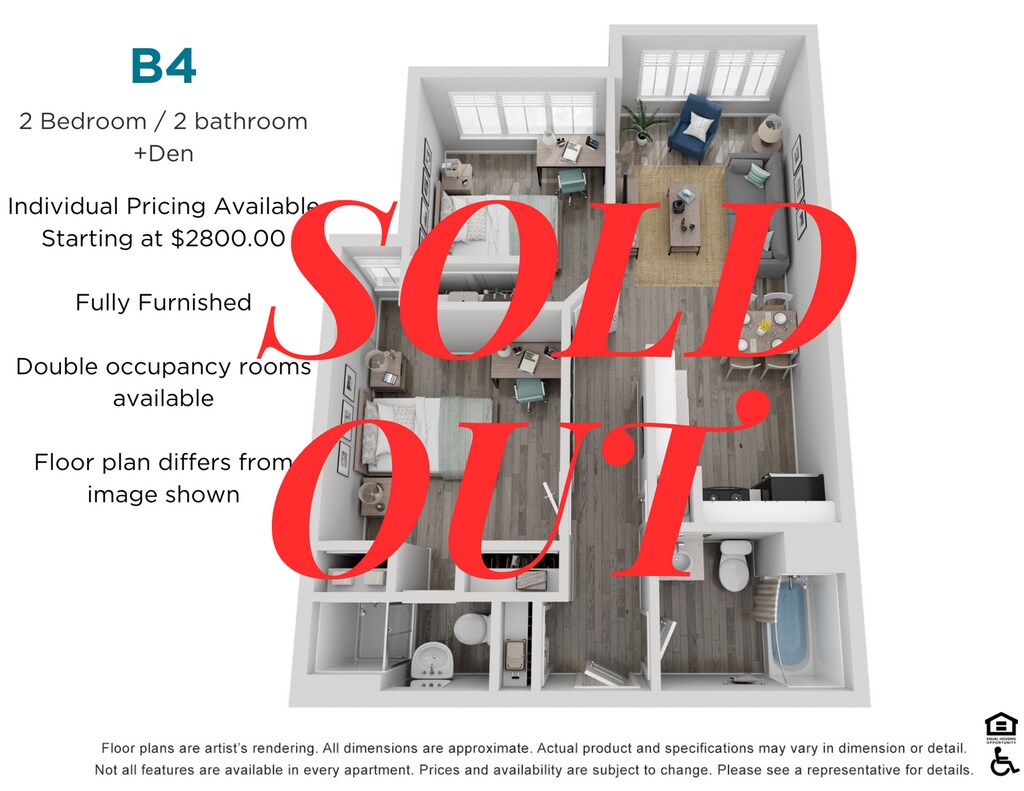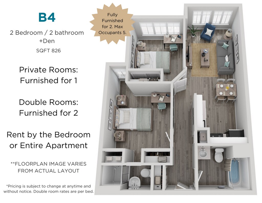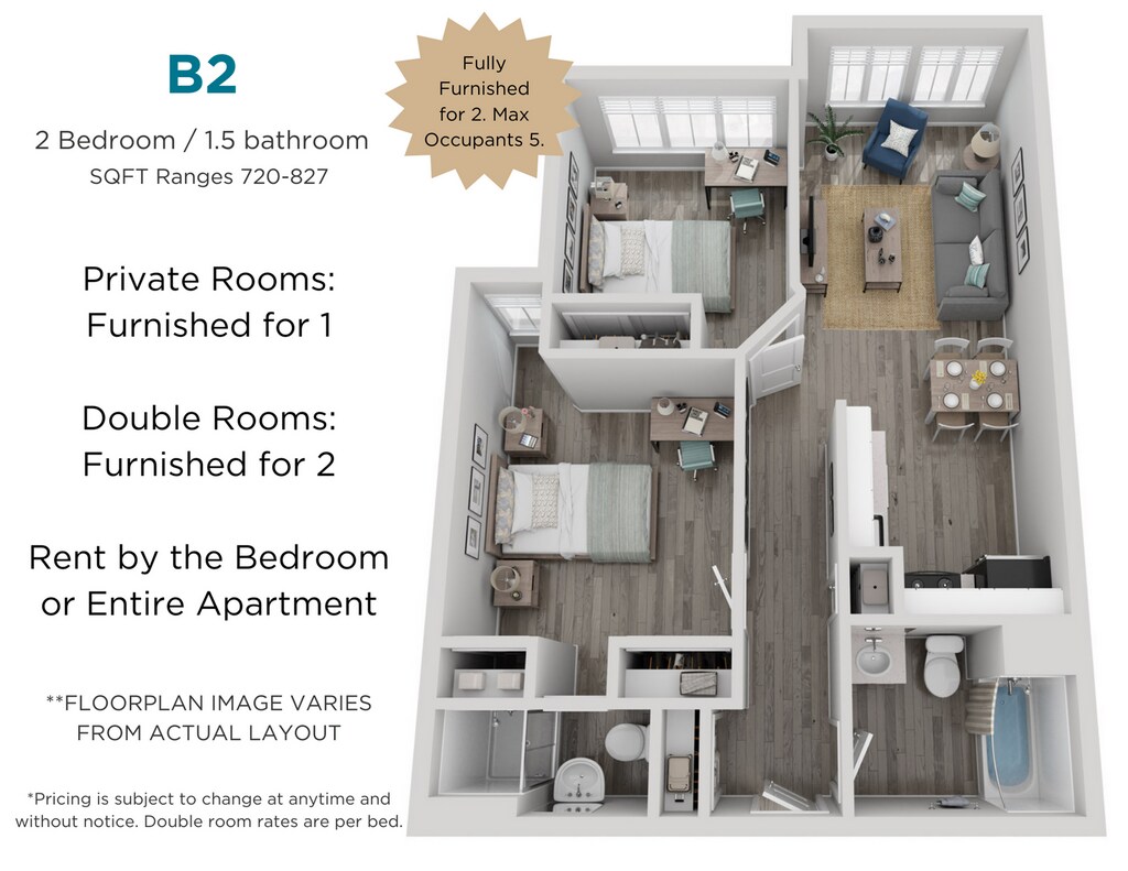B3 - Floorplan 7 Apartment Unit: PrivateApartment Model: B3$4,5002 Bedroom, 2 Bath, 856 sq ftAvailable NowApartment Unit: DoubleApartment Model: B3$2,5502 Bedroom, 2 Bath, 856 sq ftAvailable NowApartment Unit: Entire UnitApartment Model: B3$4,5002 Bedroom, 2 Bath, 856 sq ftAvailable NowFloorplan B2