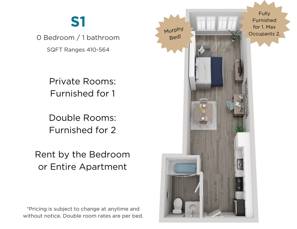 S1 - Floorplan 3 Apartment Unit: Entire UnitApartment Model: S1$3,115Studio, 1 Bath, 456 sq ftAvailable August 17, 20261 Bedroom