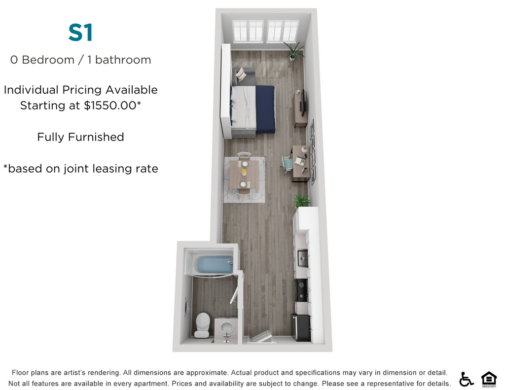 Apartment Model: S1$3,115Studio, 1 Bath, 456 sq ftAvailable August 17, 2026Floor plans are artist's rendering. All dimensions are approximate. Actual product and specifications may vary in dimension or detail. Not all features are available in every rental home. Prices and availability are subject to change. Base rent is based on monthly frequency. Additional fees may apply, such as but not limited to package delivery, trash, water, amenities, etc. Deposits vary. Please see a representative for details.