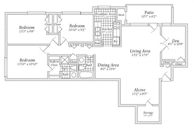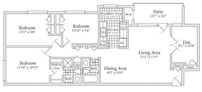 2 Bedroom 1.5 Bath (Hillwood) - Floorplan 1 2 Bedroom 1.5 Bath Den w-Alcove (Hillwood)
