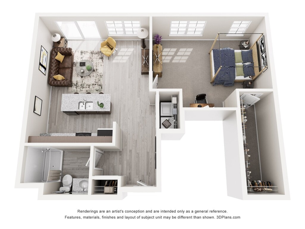 Apartment Model: RillFrom $999Studio, 1 Bath, 513 sq ftAvailable June 1, 2026Floor plans are artist's rendering. All dimensions are approximate. Actual product and specifications may vary in dimension or detail. Not all features are available in every rental home. Please see a representative for details.