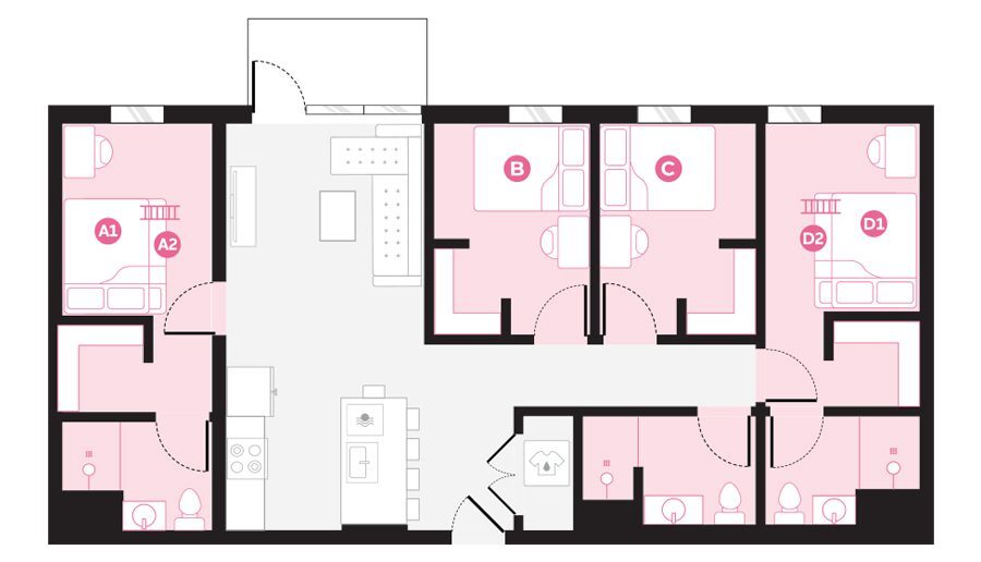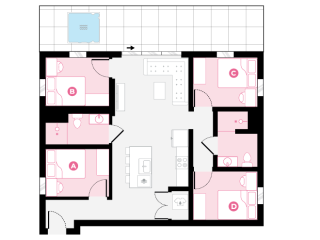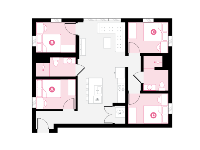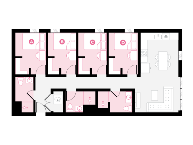 4x2 A - Floorplan 4 Apartment Unit: MansionApartment Model: 4x2 A4 Bedroom, 2 Bath, 1060-1171 sq ftAvailable August 19, 2026Apartment Unit: Mansion, Single-Shared, Vaulted CeilingApartment Model: 4x2 A4 Bedroom, 2 Bath, 1060-1171 sq ftAvailable August 19, 2026Apartment Unit: Standard, Single-Shared, BalconyApartment Model: 4x2 A4 Bedroom, 2 Bath, 1060-1171 sq ftAvailable August 19, 20264x2 C