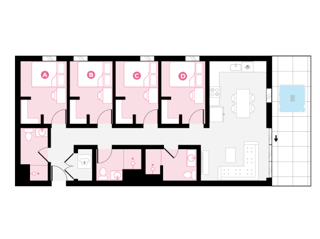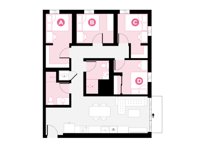 4x2 C - Floorplan 1 Apartment Unit: Standard, Single-Shared, BalconyApartment Model: 4x2 C4 Bedroom, 2 Bath, 1091-1093 sq ftAvailable August 19, 20264x4 A