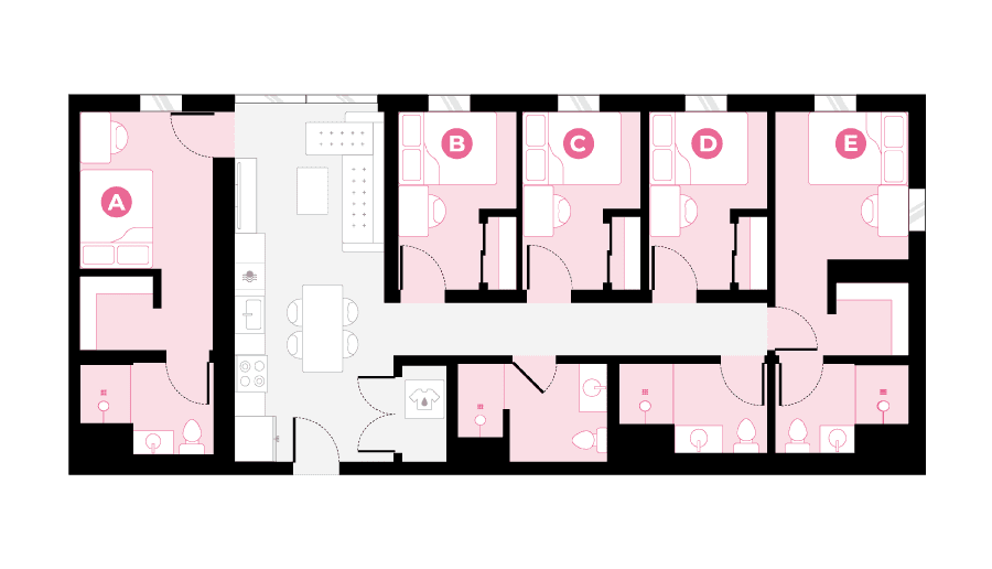 5x4 A - Floorplan 1 Apartment Unit: Standard, Single-Private, PrimaryApartment Model: 5x4 A5 Bedroom, 4 Bath, 1375 sq ftAvailable NowApartment Unit: StandardApartment Model: 5x4 A5 Bedroom, 4 Bath, 1375 sq ftAvailable August 19, 2026Apartment Unit: StandardApartment Model: 5x4 A5 Bedroom, 4 Bath, 1375 sq ftAvailable August 19, 2026