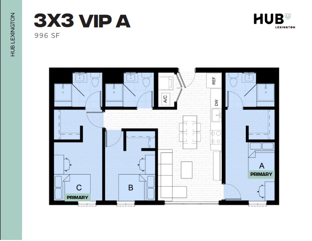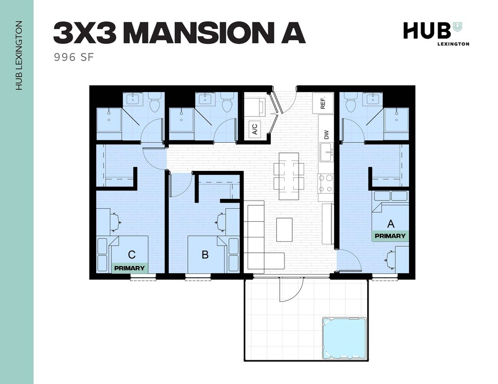 3x3 - Floorplan 1 Apartment Unit: PrivateApartment Model: 3x33 Bedroom, 3 Bath, 996 sq ftAvailable NowApartment Unit: PrivateApartment Model: 3x33 Bedroom, 3 Bath, 996 sq ftAvailable August 20, 2026Floorplan 3x2
