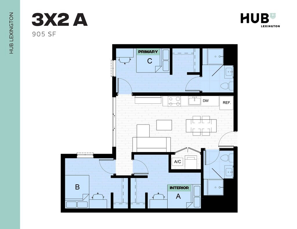 3x2 - Floorplan 1 Apartment Unit: InteriorApartment Model: 3x23 Bedroom, 2 Bath, 905 sq ftAvailable August 20, 20263x2 VIP
