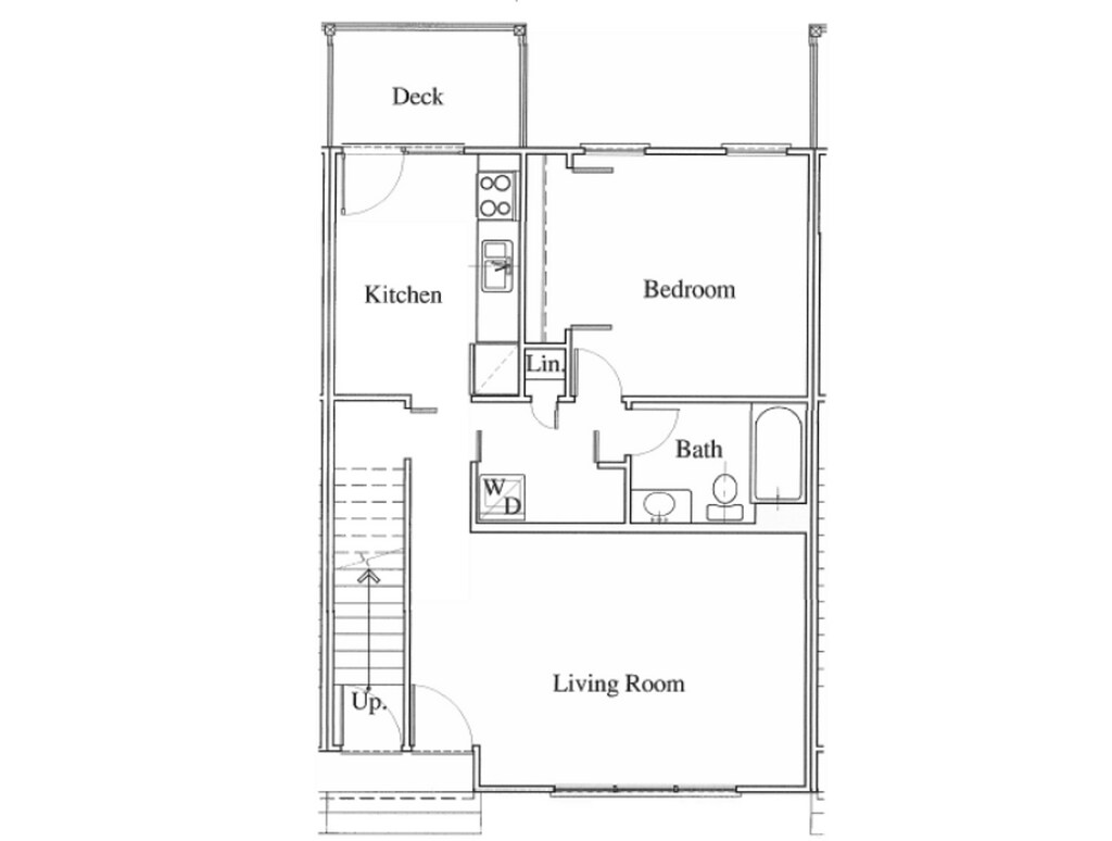 Ground level 1-bedroom apartment with hardwood floors, stainless steel appliances, and deck space.