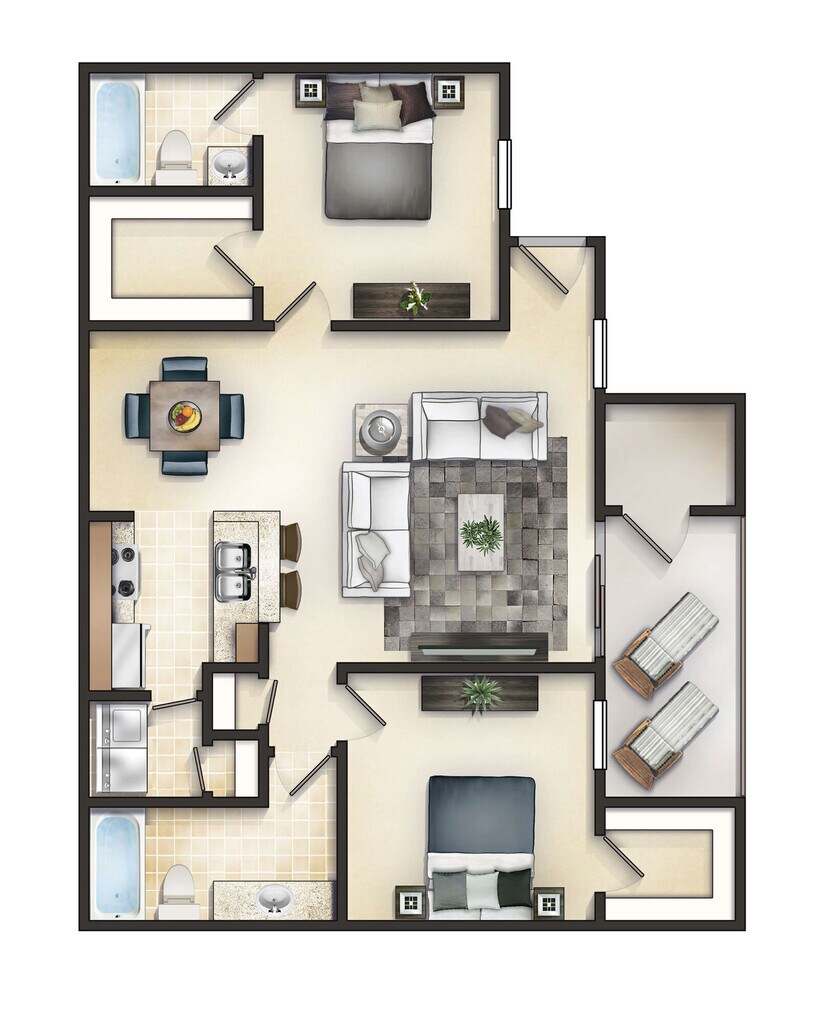 2 Beds, 2 Baths, 1000 sq ftAvailable NowModel Gallery