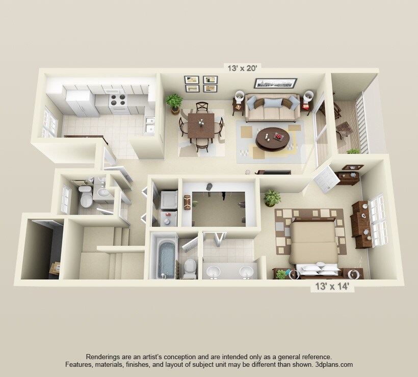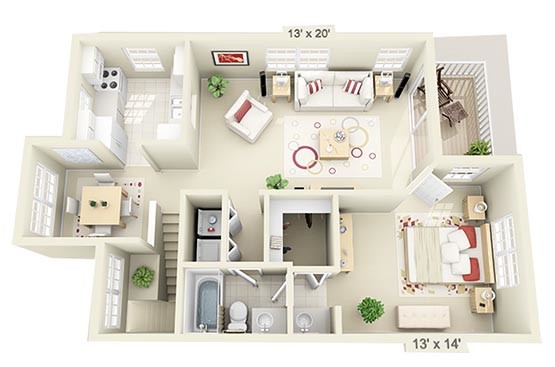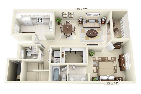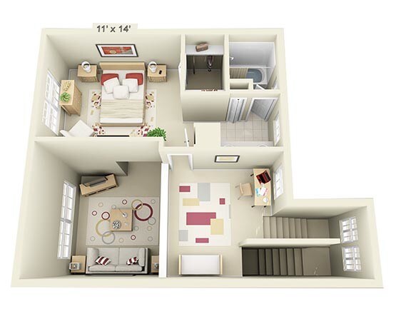 Apartment Model: 1 Bedroom DownstairsFrom $1,3151 Bedroom, 1 Bath, 760 sq ftAvailable Now![]()