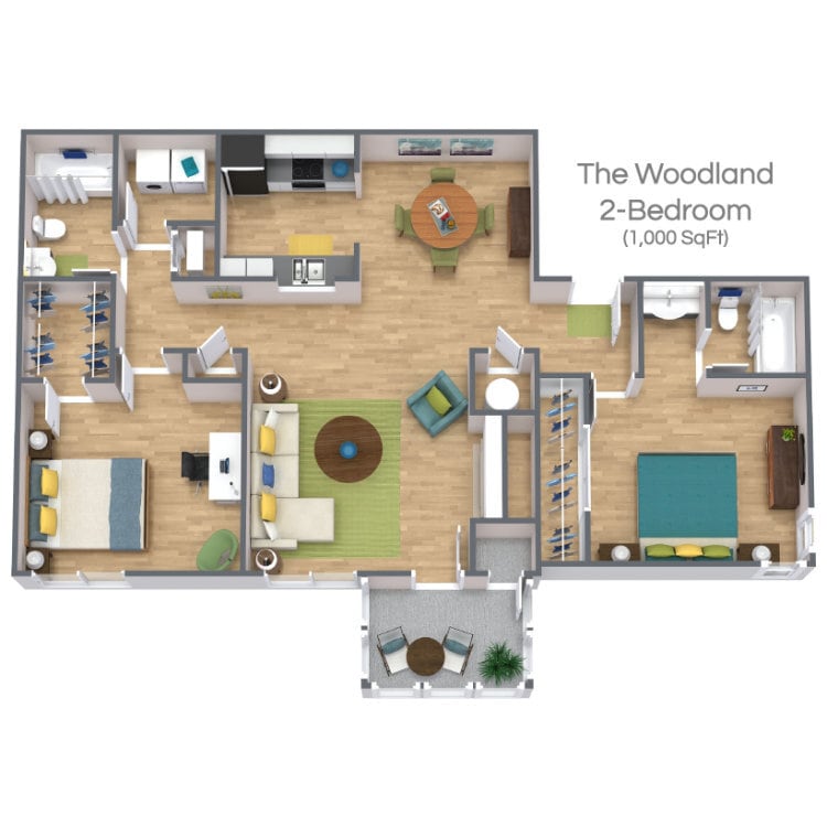 Apartment Model: The WoodlandFrom $1,2102 Bedroom, 2 Bath, 1000 sq ftAvailable NowFloorplansPhotos![]()