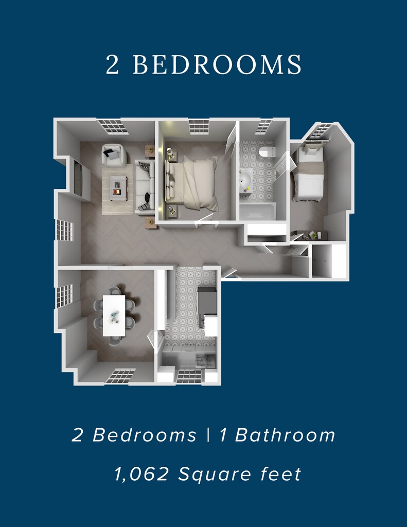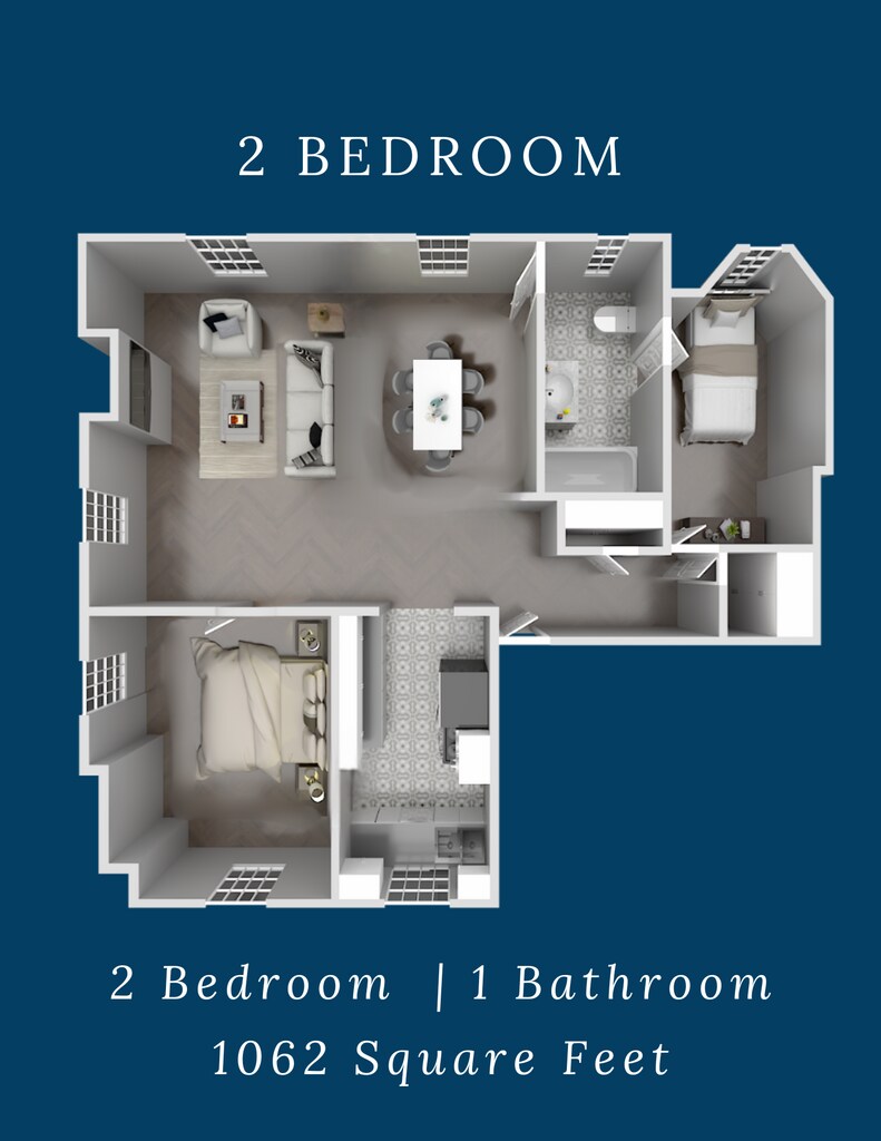 2 Beds, 1 Bath, 1062 sq ftAvailable NowModel Gallery
