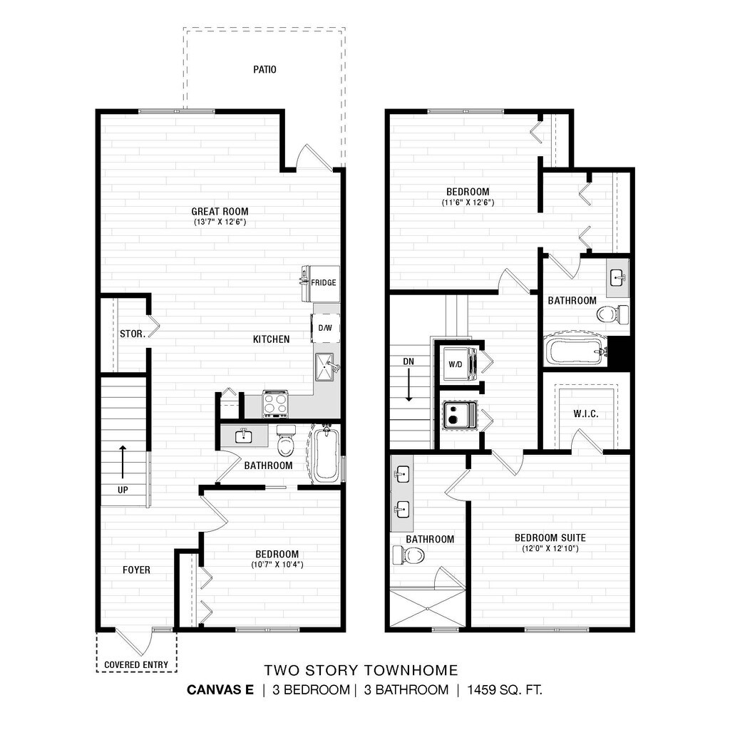 E - Floorplan 1 Apartment Unit: 4-107Apartment Model: E$3,5503 Bedroom, 3 Bath, 1459 sq ftAvailable December 8, 2025Floorplan A1