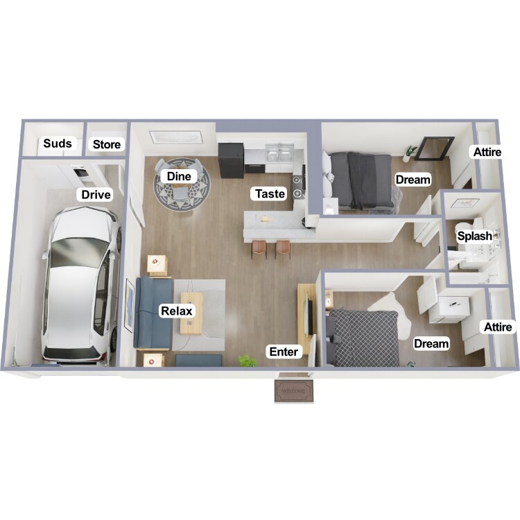 2 Beds, 1 Bath, 875 sq ftAvailable NowLargest 2 BedroomThis is the largest 2 Bedroom at this PropertyModel Gallery