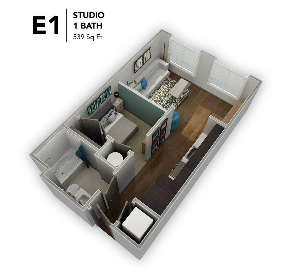 E1 - Floorplan 1 Apartment Unit: 010443Apartment Model: E1$1,520Studio, 1 Bath, 539 sq ftAvailable January 12, 20261 Bedroom