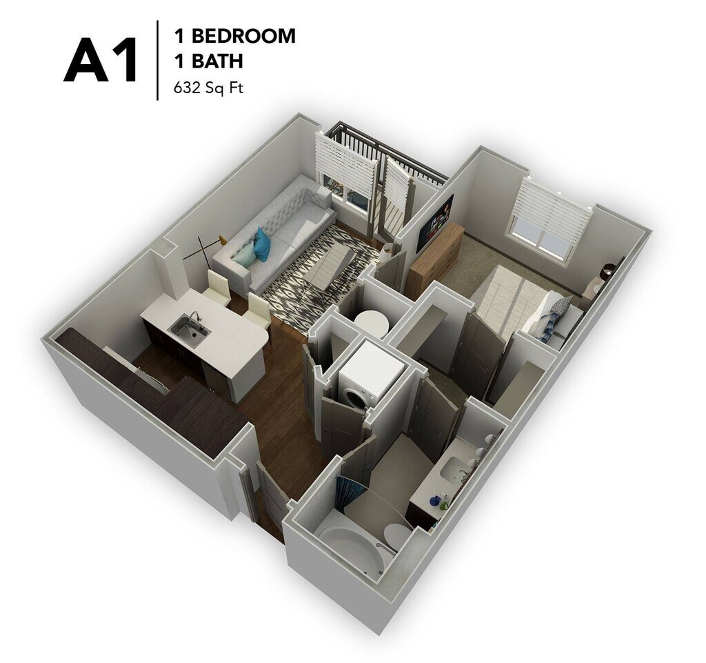 Apartment Model: A1From $1,6451 Bedroom, 1 Bath, 624-632 sq ftAvailable Now![]()