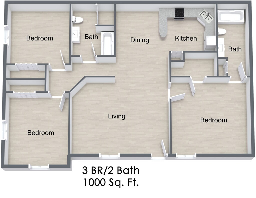 3 Bed 2 Bath - Floorplan 2 Apartment Unit: 13103Apartment Model: 3 Bed 2 Bath3 Bedroom, 2 Bath, 1000 sq ftAvailable December 7, 2025Apartment Unit: 09102Apartment Model: 3 Bed 2 Bath3 Bedroom, 2 Bath, 1000 sq ftAvailable December 12, 2025Apartment Unit: 06101Apartment Model: 3 Bed 2 Bath3 Bedroom, 2 Bath, 1000 sq ftAvailable December 15, 2025