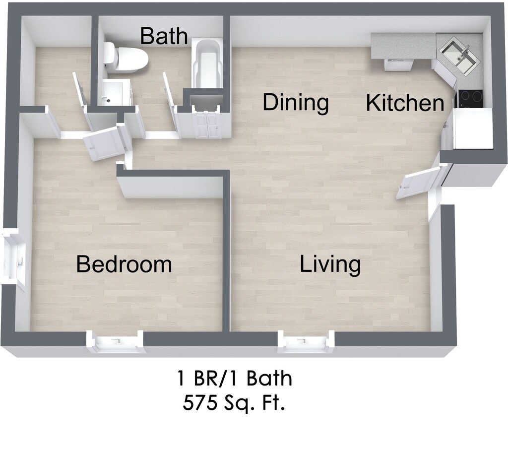 1 Bed 1 Bath - Floorplan 2 Apartment Unit: 02204Apartment Model: 1 Bed 1 Bath1 Bedroom, 1 Bath, 575 sq ftAvailable NowApartment Unit: 02102Apartment Model: 1 Bed 1 Bath1 Bedroom, 1 Bath, 575 sq ftAvailable NowApartment Unit: 01101Apartment Model: 1 Bed 1 Bath1 Bedroom, 1 Bath, 575 sq ftAvailable Now2 Bedrooms
