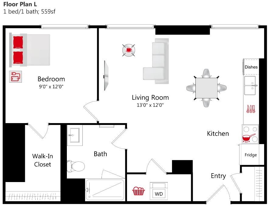 1 Bed, 1 Bath, 559 sq ftAvailable NowModel Gallery