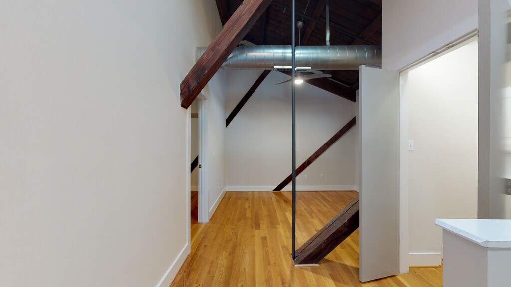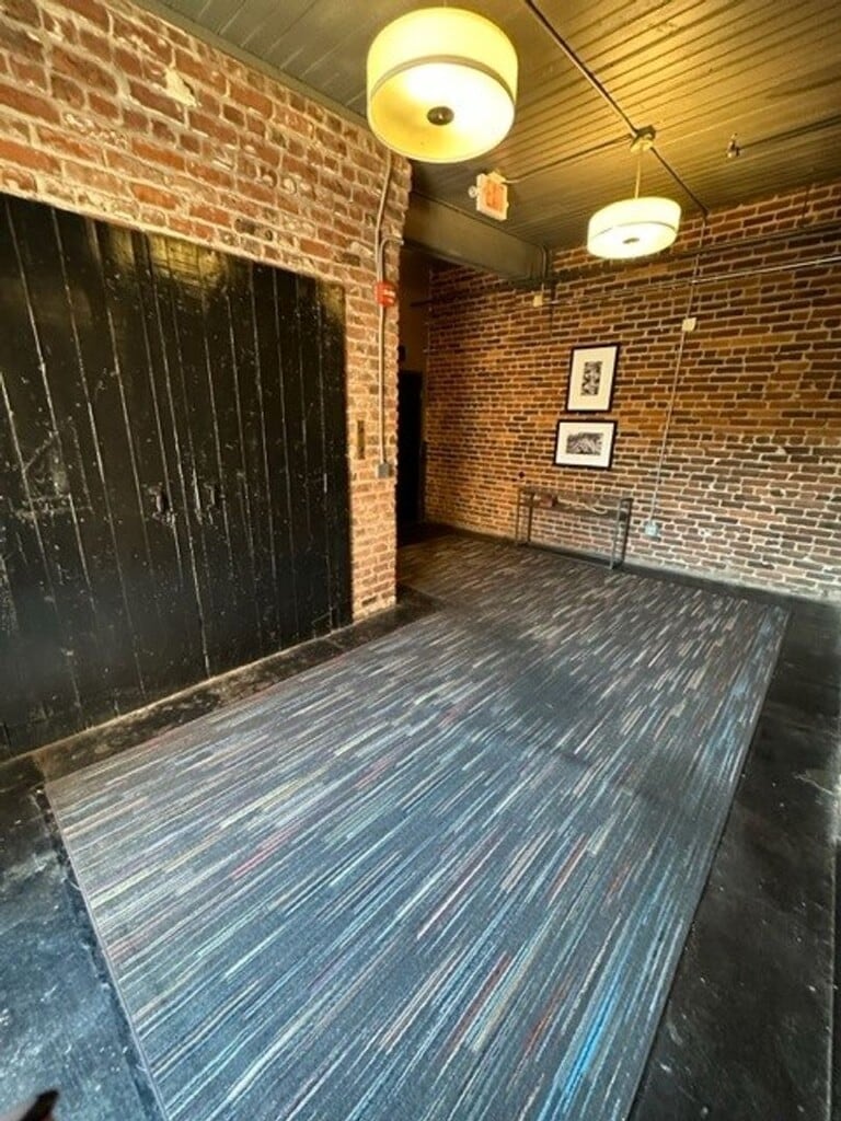 - Exposed heavy timber beams and brick walls