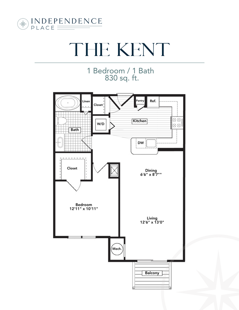 Apartment Model: The Kent1 Bedroom, 1 Bath, 830 sq ftAvailable December 1, 2025![]()