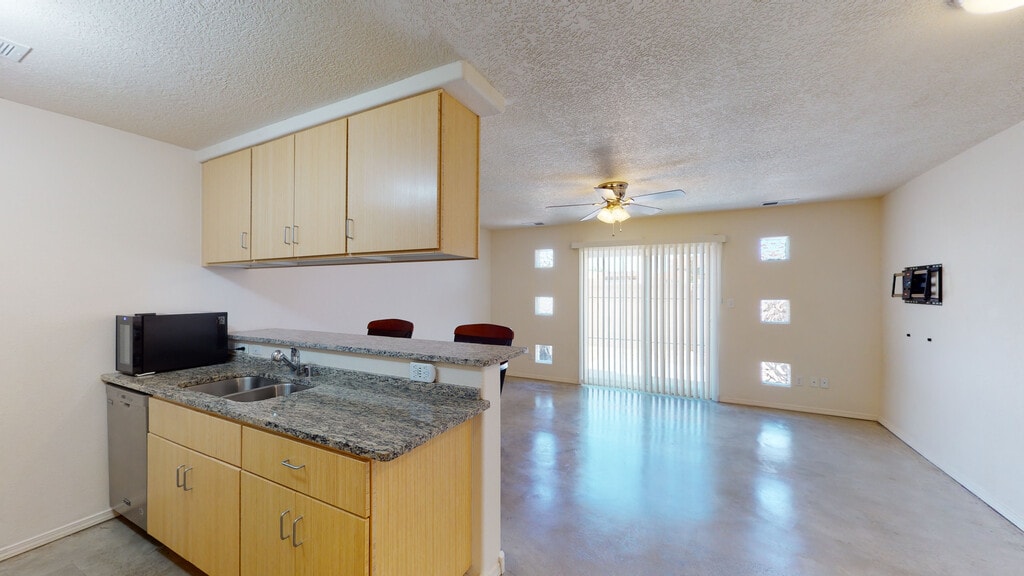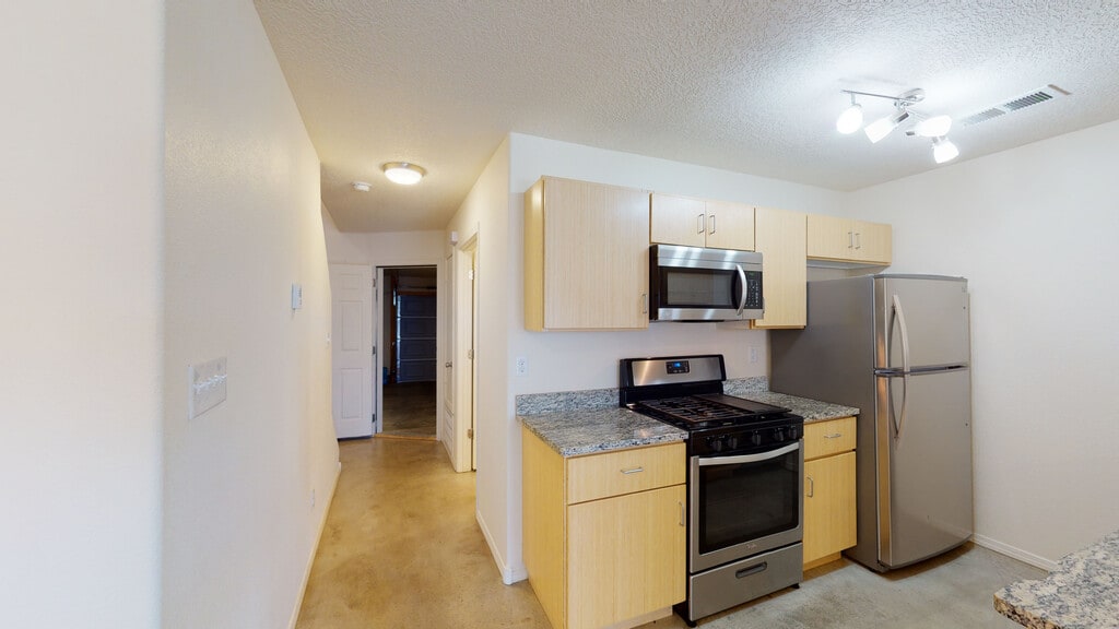 Contemporary Designed Town Home in excellent northeast height's location. Well-designed floor plan. 2017 construction, extremely low energy bills. Full stainless steel appliance package, granite countertops and bamboo cabinets. Sealed concrete floors downstairs, quality wood laminate upstairs. Bedrooms are big and bright with vaulted ceilings and in-suite bathrooms. Private backyards and common outdoor living areas feature low maintenance native landscaping and fruit trees. Other features include custom tile work in wet areas, highly efficient furnaces, and attached garages. Photos may be of similar units in the same complex. Great hiking and mountain biking in the Sandia Mountain foothills less than one mile east! On-site manager. Locally owned and managed, a beautiful private community.