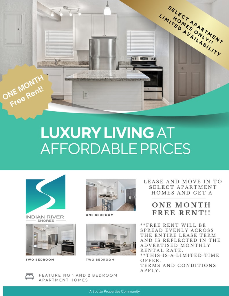 Indian River Shores Apartments offers 1 to 2 Bedroom apartments starting from $1,010 and having 514–642 sq ft. Here is the current pricing and availability:
