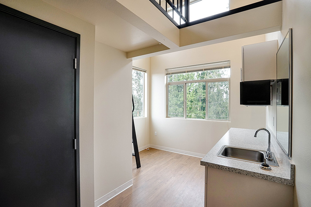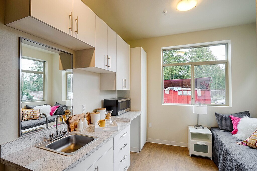 Welcome to Interurban Lofts, Shoreline's first micro-apartments, opening January 2017. Interurban Lofts is a hybrid of modern and affordable living at the intersection of work and play. Here you are surrounded by local amenities ranging from local restaurants, entertainment, grocery stores, healthcare, and much more. Interurban Lofts is your portal to work & play without the high cost of a city. Welcome home! With the unique setup of 8 studio units per 'pod', choose to cook for one or for many in the shared kitchen or take it outside to the patio with a BBQ & heat lamps. This is the perfect atmosphere to connect with your neighbors over food & conversation while still having the privacy of your own loft. Each unit has it's own full bathroom and comes partially furnished with a bed, microwave, and mini-fridge. 8 studios per 'pod'. Each 'pod' has it's own shared kitchen & washer/dryer Utilities and Wi-Fi included in rent Large common area lounge with outdoor patio & BBQ