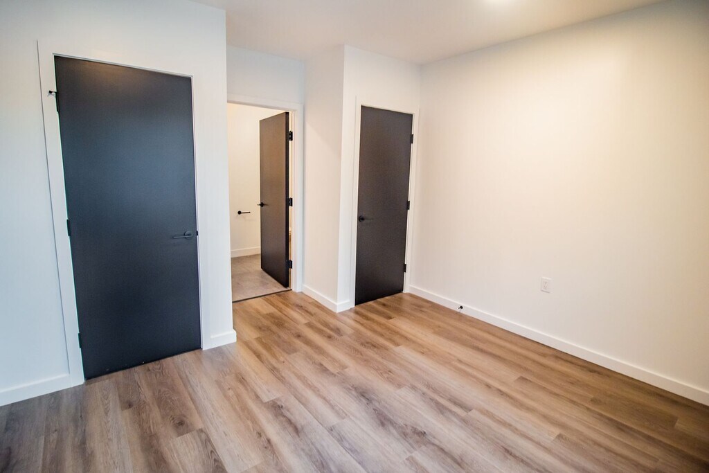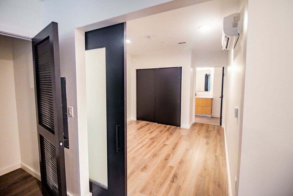 The B5 floorplan is centrally located and boasts a bright and open living area that features a modern kitchen with imported cabinets and Energy-Star appliances. Enter the bedroom through an industrial barn door to find a spacious room with a large closet. The bathroom is just across the hall and features a walk-in shower and vanity for additional storage. Each apartment features luxury plank flooring throughout, matte black finishes, and an in-unit washer and dryer. *Actual floorplan may vary.