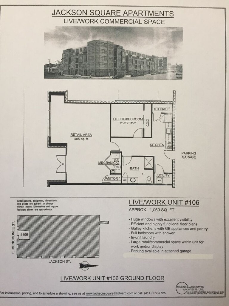 Prime Third Ward Location on the corner of Jackson and Menomonee Streets! Located across the street from neighborhood staples Camp Bar and the Italian Community Center. This unique live/work space has 485 square feet of retail/work space, plus a private one bedroom/one bath apartment attached - totaling 1,060 spacious square feet! Soaring 10-foot ceilings and floor-to-ceiling windows make this space light and bright! You won't find this type of space anywhere else. Call today to set up a private showing for your new adventure!
