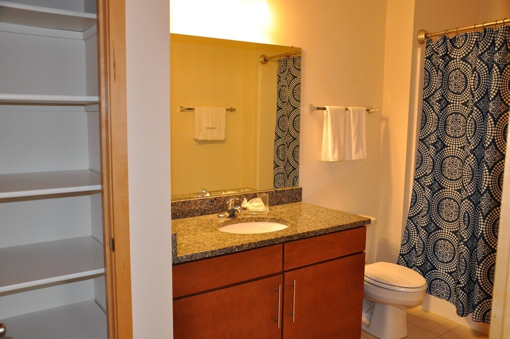 Modern luxury living awaits you in Milwaukee’s Historic Third Ward neighborhood! This apartment home features hard plank flooring throughout and 10-foot ceilings with floor to ceiling windows! The kitchen is fully equipped with granite counter tops, stainless steel appliances and plenty of cabinet storage. The open concept living room brings in plenty of natural light, especially on the large private terrace. The large bedroom features low-profile neutral carpeting. A walk-in closet built-out with custom shelving and bars makes organization and storage a breeze. The spacious bathroom includes a large vanity, bathtub, and more storage space.