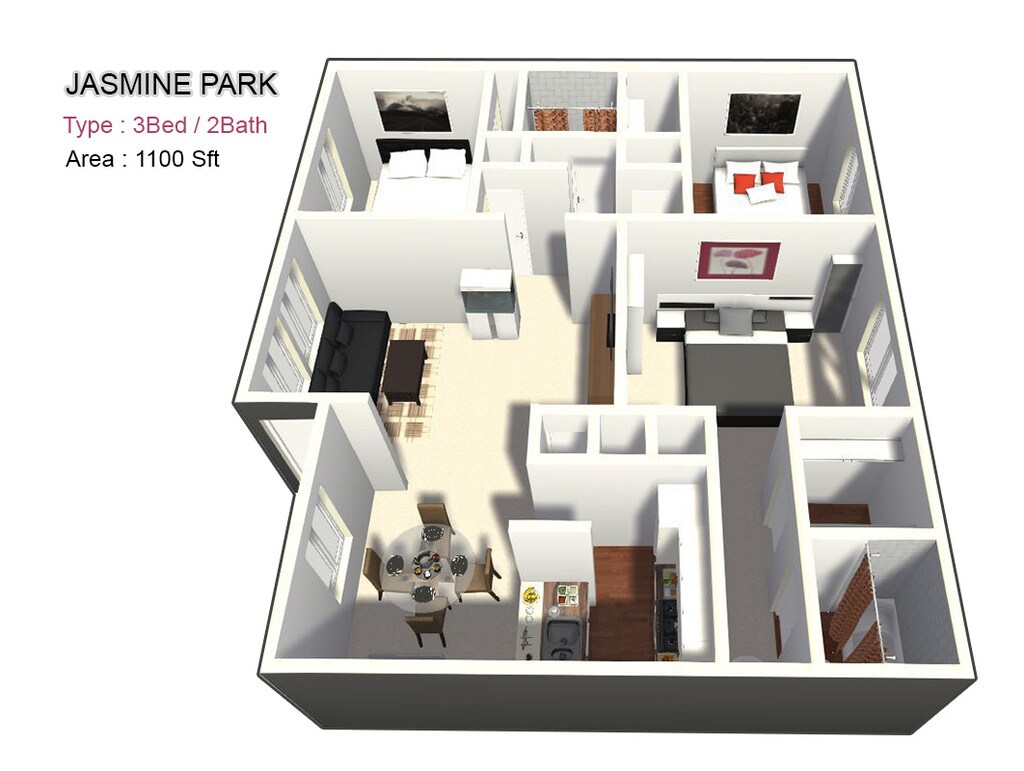 Three Bed / Two Bath - Floorplan 2 Apartment Unit: 519Apartment Model: Three Bed / Two Bath3 Bedroom, 2 Bath, 1100 sq ftAvailable May 1, 20264 Bedrooms