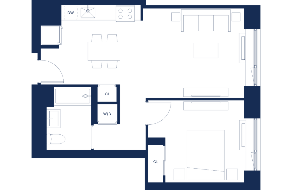 1 Bedroom Classic East Floors 2-8 - Floorplan 1 1 Bed & Home Office Modern West Floors 2-11