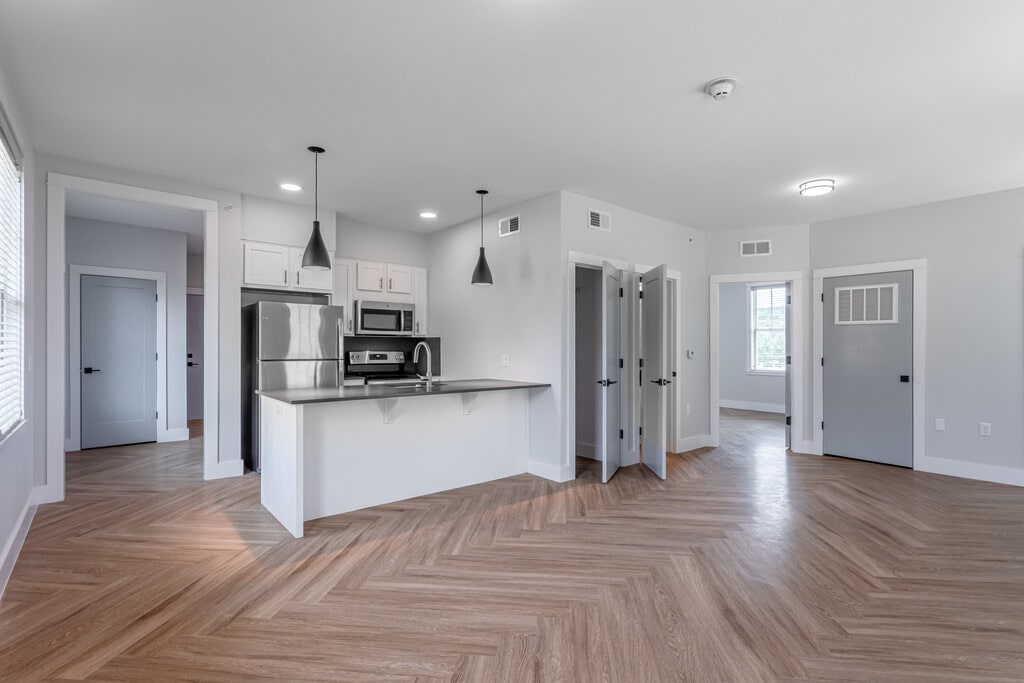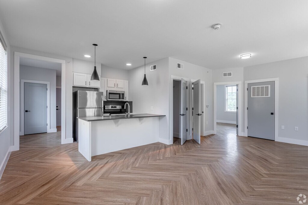 - Unit Description- Discover refined living in this beautifully designed 1 bed, 1 bath residence offering 732 square feet of thoughtfully crafted space. With natural light streaming in from two sides and large windows throughout, this home feels bright, open, and welcoming. Enjoy soaring 9-foot ceilings and premium finishes including soapstone quartz countertops, tile-surround showers, and striking herringbone floors that bring a touch of timeless sophistication to every room. A full-size washer and dryer add everyday convenience, while a lighted oversize closet provides both functionality and flair. Perfectly blending form and function, this upscale home is a standout offering the comfort, style, and quality you deserve. - Model Rent and Fees- Price- $1,400