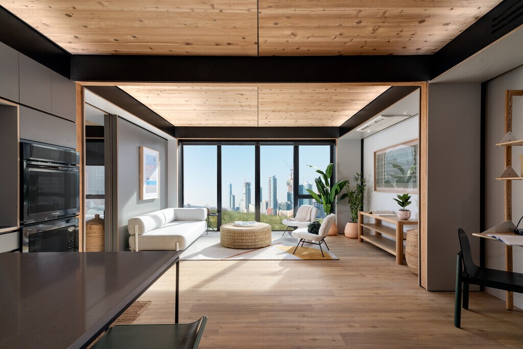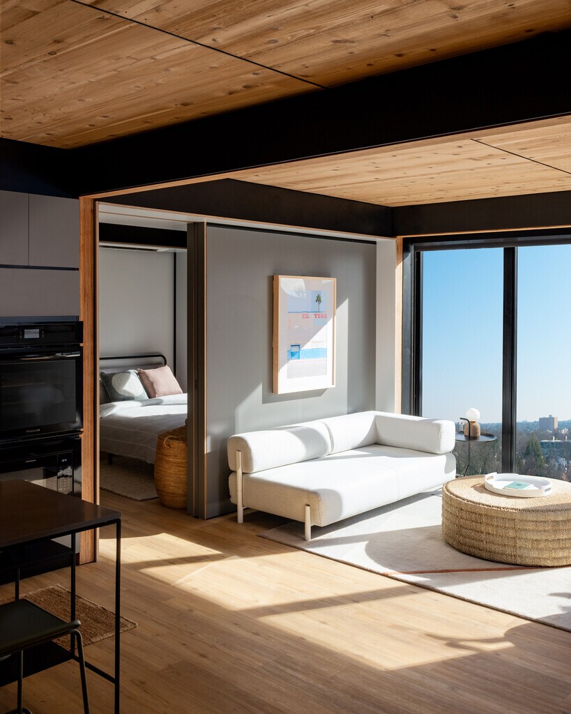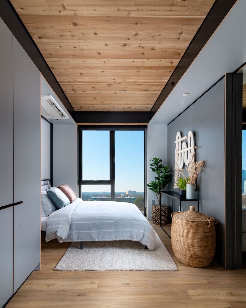 Juno East Austin features inspirational apartment designs that empower healthier living, cutting edge technology that lowers energy consumption and utility costs and offers residents a sustainable lifestyle they will love. Enjoy the daylight from the floor to ceiling windows, the exposed natural wood throughout each apartment, and the gorgeous lobby that is perfect for working from home or catching up with friends. Now leasing, call today to schedule your tour!