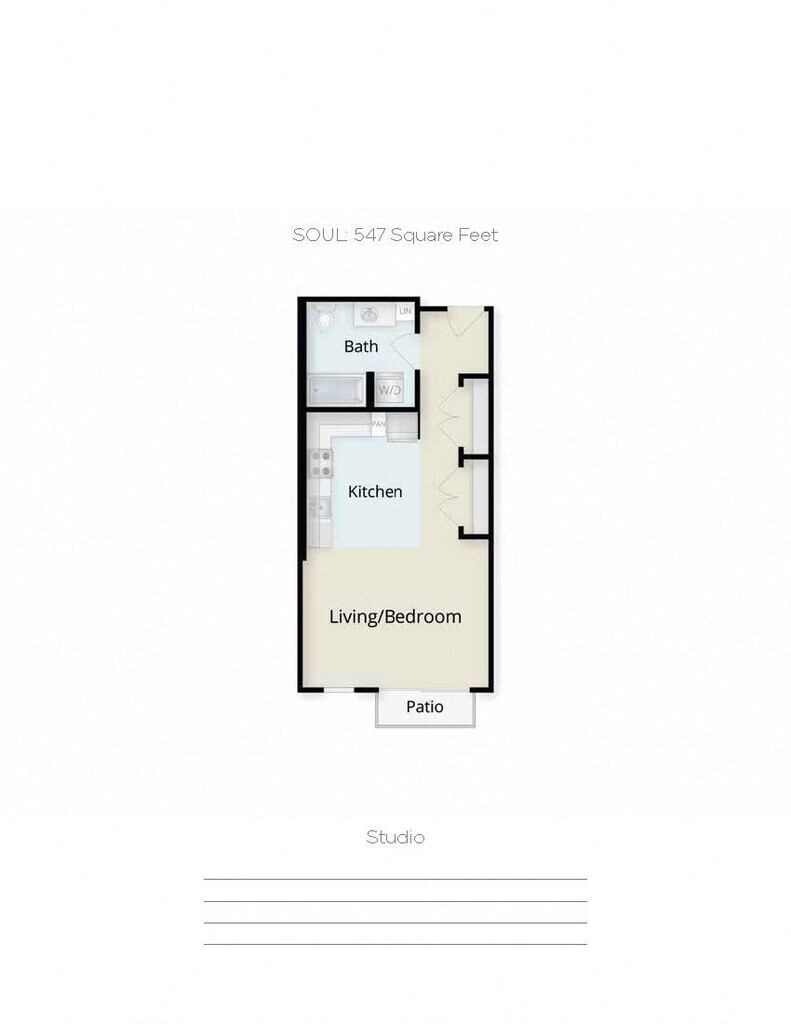 Soul - Floorplan 1 Apartment Unit: X-304Apartment Model: Soul$1,709Studio, 1 Bath, 547 sq ftAvailable Now1 Bedroom