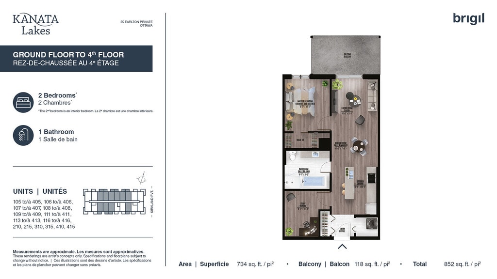 Kanata Lakes offers 1 to 2 Bedroom apartments starting from $2,425 and having 546–889 sq ft. Here is the current pricing and availability: