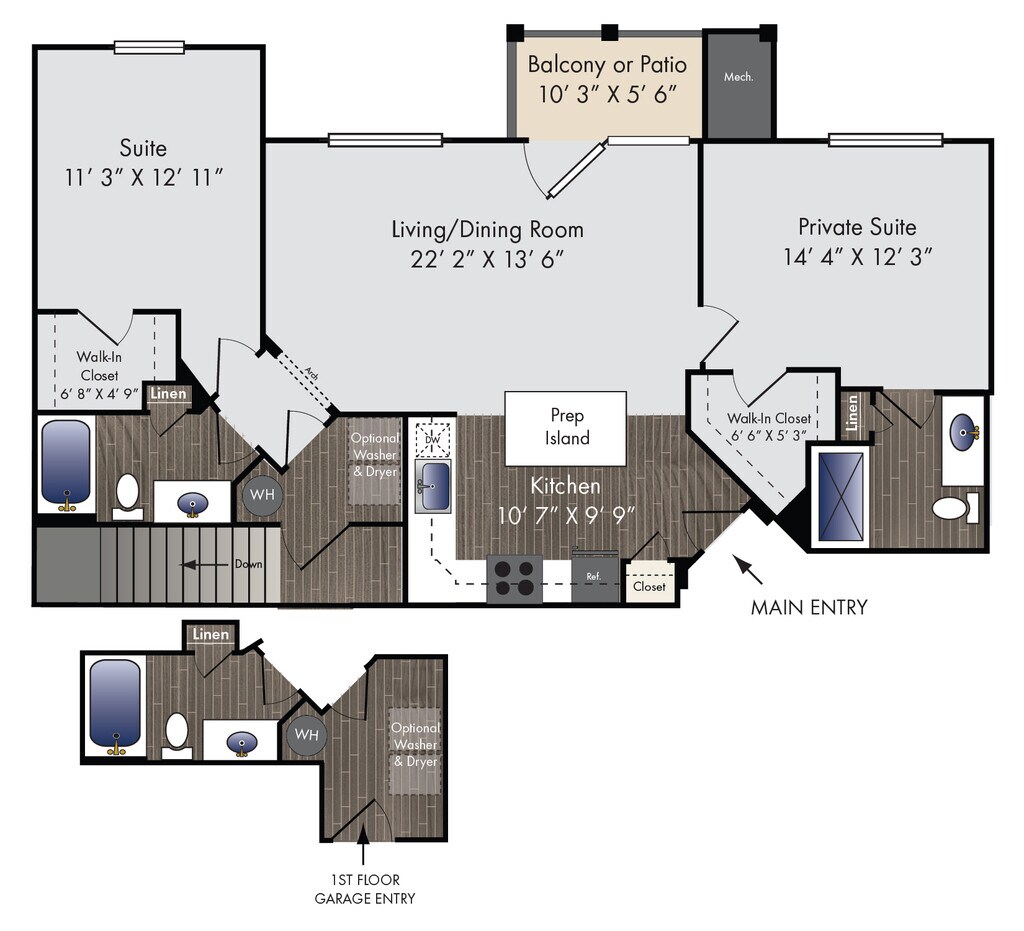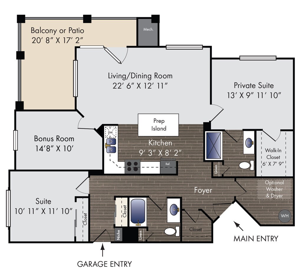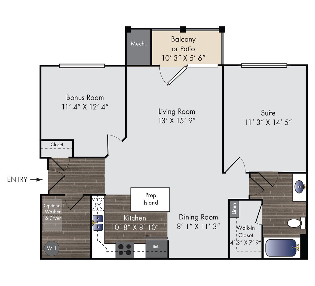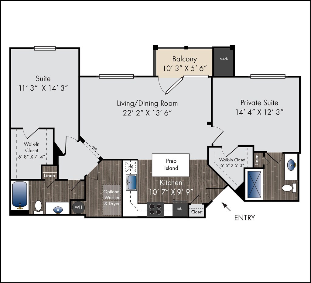 1 Bed, 1 Bath, 1068-1105 sq ftLargest 1 BedroomThis is the largest 1 Bedroom at this PropertyModel Gallery