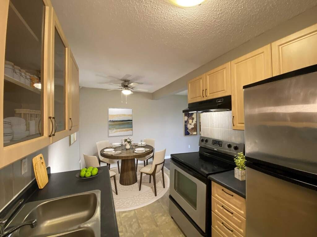 There's something peaceful about King's Court apartments for rent in Inglewood, just a sort of calm that runs through this central area making it a place of focus and serenity. These pet-friendly, smoke-free, fully-renovated, boutique apartments are low-density, meaning fewer people and less noise, as well as more space which is also safer in terms of health protocols. Imagine relaxing on your balcony and letting the sun hit your face as your favourite song plays gently in the background. This three-story building is easy on the budget as Mainstreet pays your heat, water, and electricity, too. We provide onsite laundry, and make moving easy by including an in-unit storage room, fridge, stove, window coverings, and making dishwashers and parking stalls available as well. The high-grain laminate floors in every unit leave you a blank page to decorate, and they're all cable-ready and internet-ready for the fastest possible connection. There's nothing to keep you up at night in this quiet part of town with our security patrols and secured entry with intercom. People love that we pay your utilities and they love the peace of the area, so don't miss out - hurry and apply online now! Location Details: Mainstreet's King's Court rental apartments in the Inglewood area of Edmonton are located ideally, a perfect oasis of calm amid the hustle of the city. You've got easy dining options all over the place, with McDonald's and AandW right across the street and Haus Falkenstein and Tokyo Express just up the street. Major bus stops are within walking distance. Nearby amenities also include: - Coronation School (International Baccalaureate Primary School) only 15-18 minute walk | 5-minute drive - Archbishop Macdonald High School only 15-17 minute walk | 4-minute drive - Wholesale Club Grocery store right across the street These serene units go quickly; apply online now!