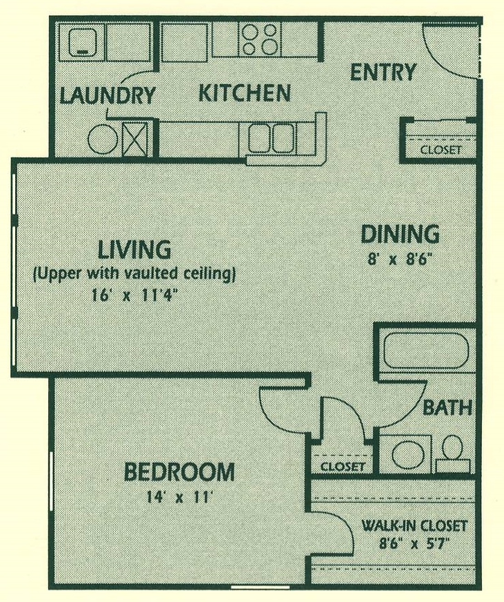 This roomy 2BR/2BA apartment homes features a large living room with triple windows & a vaulted ceiling, separate dining area, kitchen with double sink and garbage disposal, dishwasher, electric self-cleaning stove and fridge. There are two large bedrooms (main with a walk-in closet and full bathroom), a full guest bathroom and a linen closet. It also has a large closet with washer and dryer hook-ups.