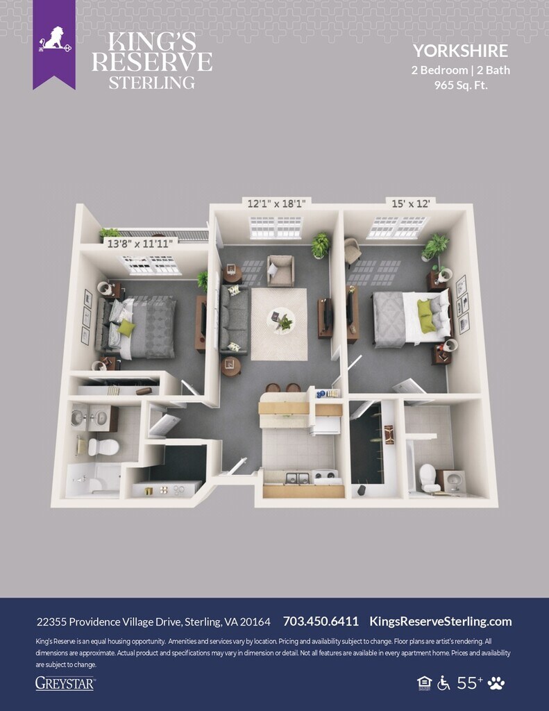 Kings Reserve Sterling 55+ Active Adult Apartments offers 1 to 2 Bedroom apartments starting from $1,848 and having 620–965 sq ft. Here is the current pricing and availability: