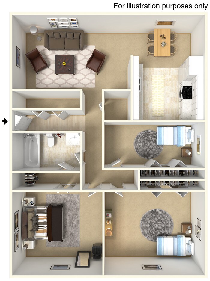 Apartment Model: 3 Bed 1 BathCall For Rates3 Bedroom, 1 Bath, 1056 sq ftUnavailable![]()